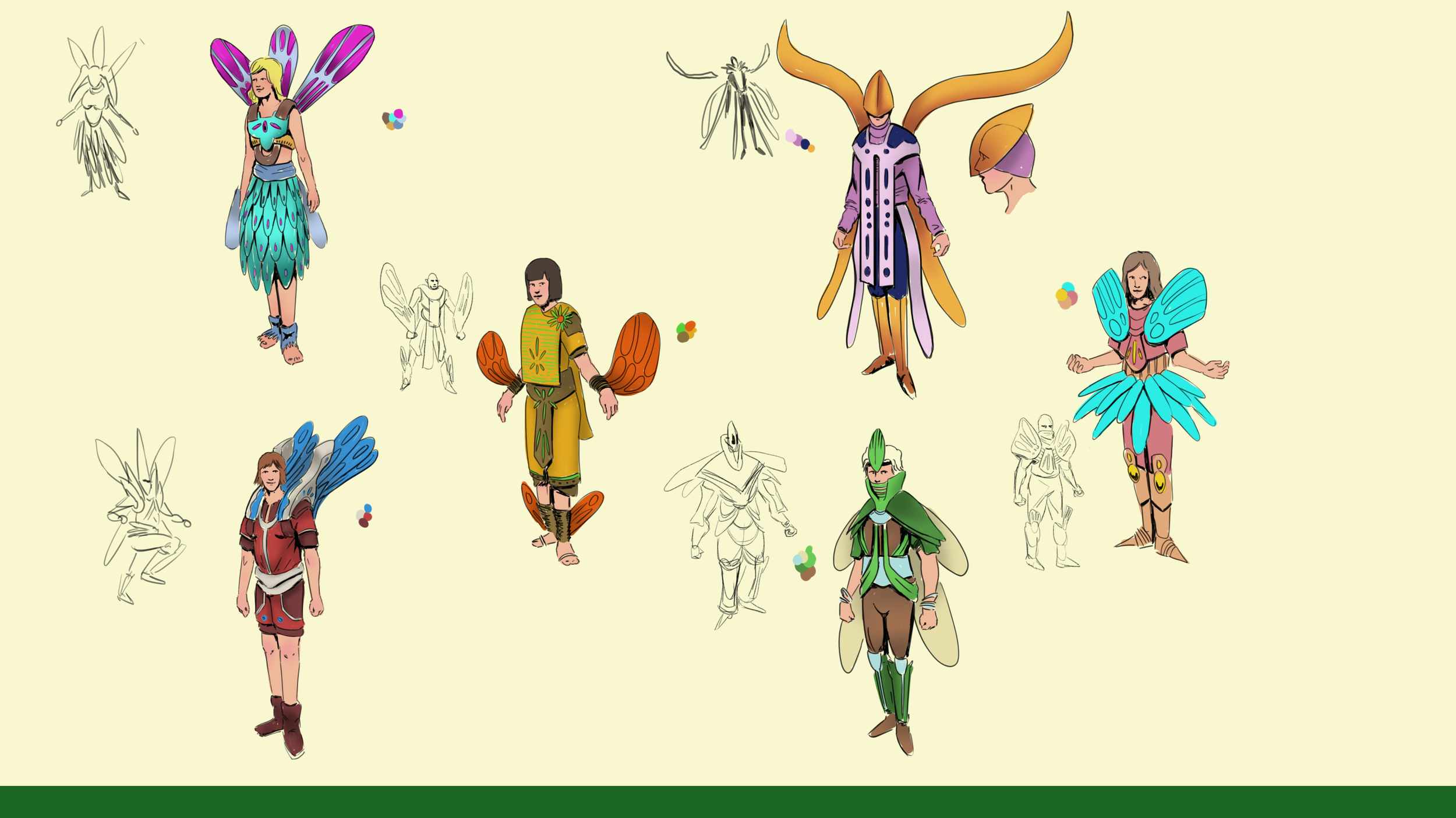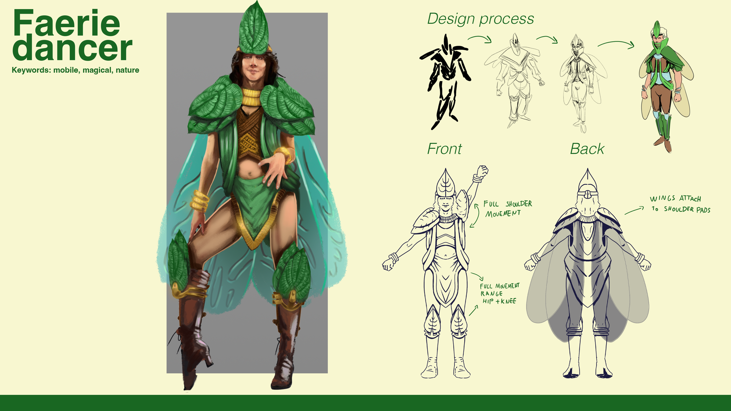A dancer in real life needs to be able to have full dexterity and range of motion to perform. Putting the dancer in a fantasy outfit can therefor be rather tricky. In this design, I tried solving that issue. I made numerous designs, but each step forward meant rethinking if the wearer of this outfit could move.
